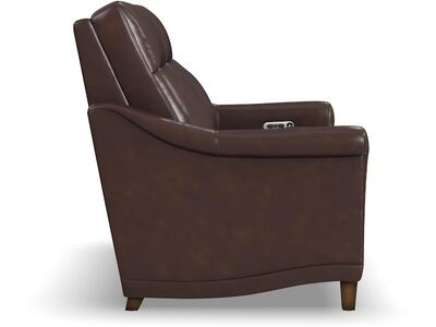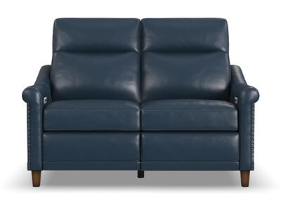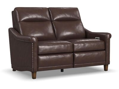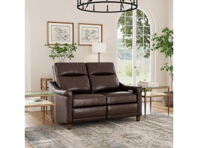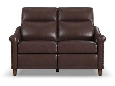 Timeless, traditional details meet today’s modern comfort capabilities with the Elizabeth leather power reclining loveseat. Inspired by vintage stationary furniture, this loveseat features sloped, petite roll arms, curved side base rails and decorative nailhead trim reminiscent of a bygone era. A high-divide back, extended footrests and powered headrests provide support for complete relaxation. Upholstered in a buttery-soft, durable, brunette brown leather, the Elizabeth loveseat exudes elegance and luxury.