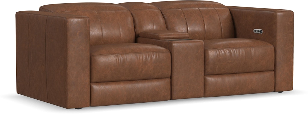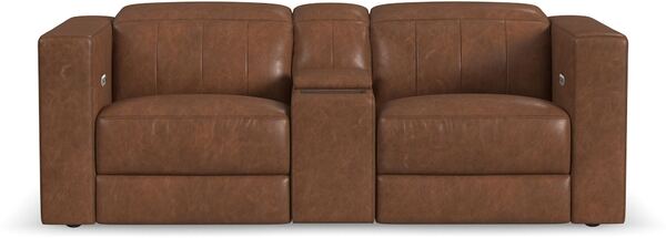 Casually elegant and substantial in form, the Austin power reclining loveseat with power headrests and console defies expectations with customizable comfort and Zero Gravity technology. Wide track arms, spacious seat cushions, and integrated storage beckon relaxation, while alluring in-back channeling and a bold geometric profile add contemporary flair. Upholstered in sumptuous leather that develops a patina as it ages, the Austin loveseat is designed for those who appreciate the authentic character of materials.